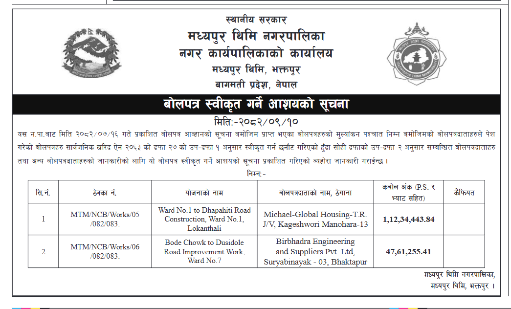 » मिति २०८२।०९।१० गते गोरखापत्रमा प्राकाशित बोलपत्र स्वीकृत गर्ने आशयको सूचना