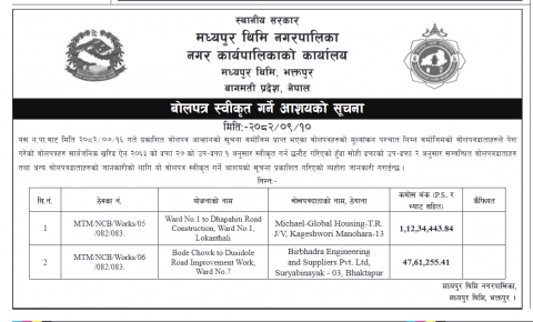 मिति २०८२।०९।१० गते गोरखापत्रमा प्राकाशित बोलपत्र स्वीकृत गर्ने आशयको सूचना