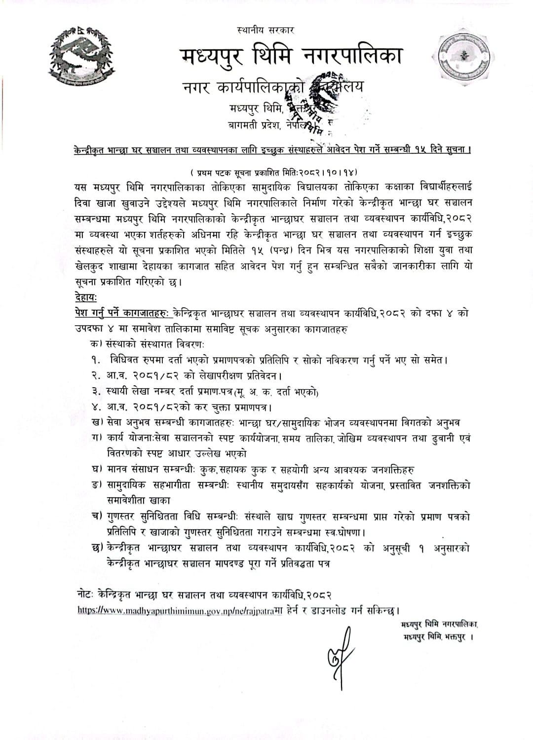 15-day notice regarding submission of applications by interested organizations for operation and management of centralized kitchens.