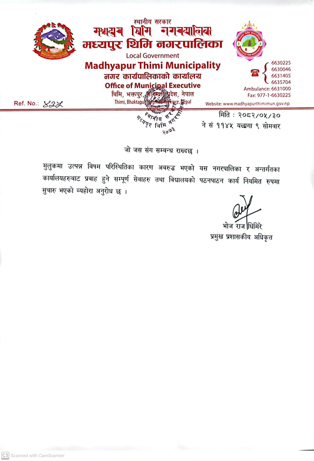 Notice that all services provided by the municipality and offices under the municipality and school teaching and learning have resumed.