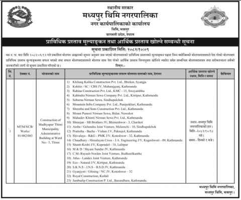 Notice published in Gorkhapatra dated 2082.10.09 regarding the evaluation of technical proposals and opening of financial proposals of MTM/NCB/Works/01/082/083