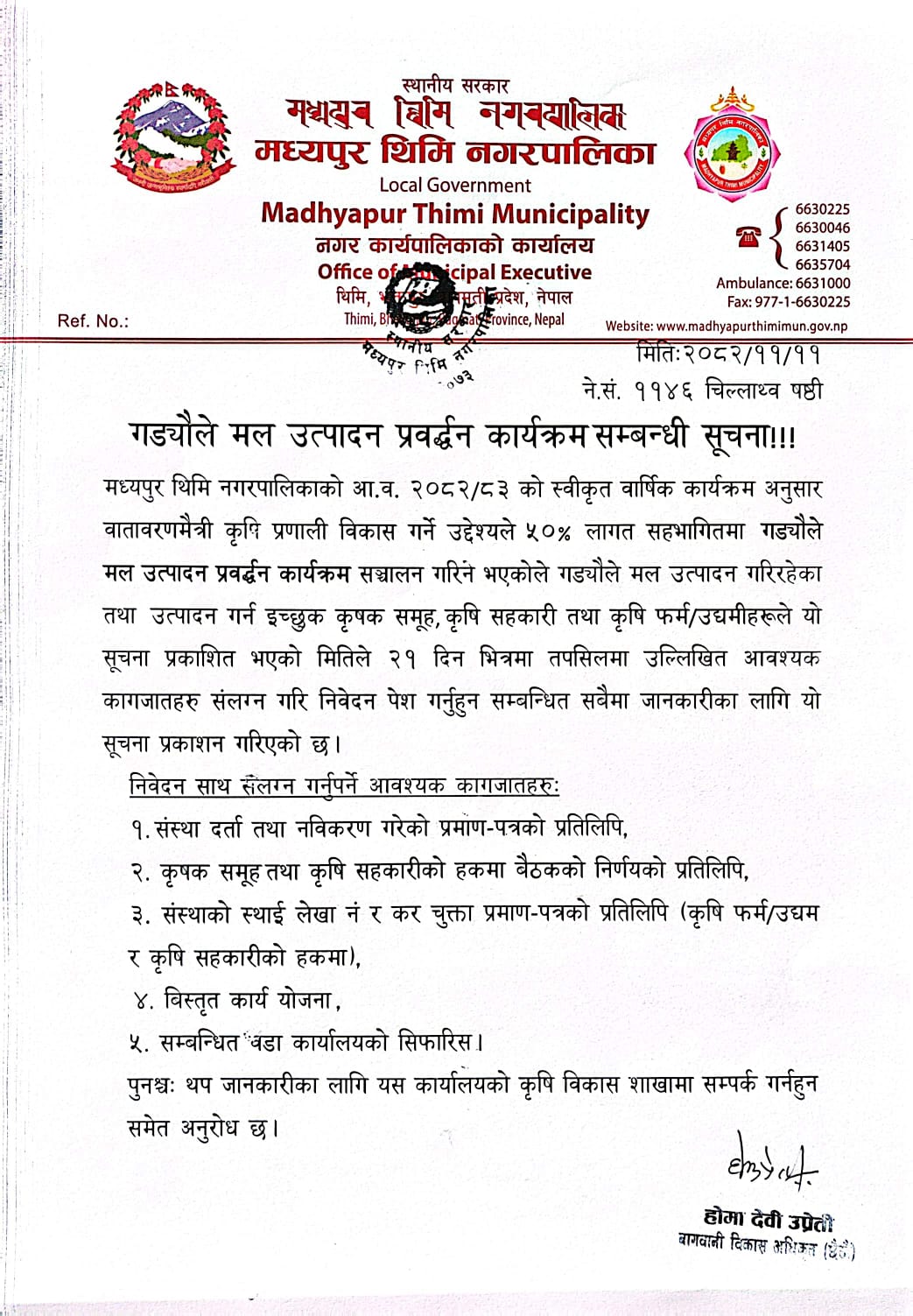 मकै तथा कौशी खेती प्रवर्द्धन कार्यक्रम, मध्यपुर थिमि न.पा.-२ सम्बन्धी सूचना