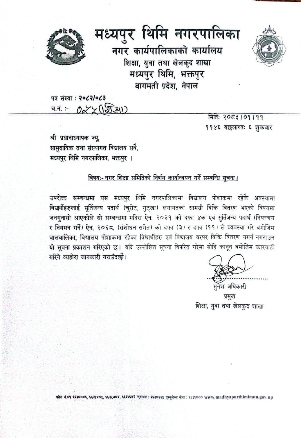 नगर शिक्षा समितिको निर्णय कार्यान्वयन गर्ने सम्बन्धी सूचना