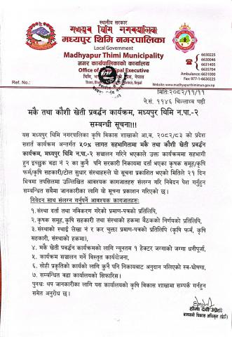 मकै तथा कौशी खेती प्रवर्द्धन कार्यक्रम, मध्यपुर थिमि न.पा.-२ सम्बन्धी सूचना