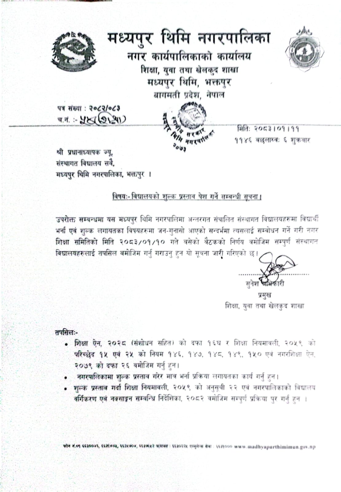 विद्यालयको शुल्क प्रस्ताव गर्ने सम्बन्धी सूचना